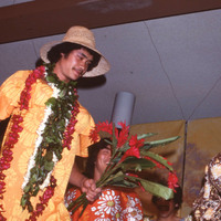 Several male dancers performing in drag at Pacific University's annual Lu'au in 1977. The man in front is wearing an orange dress and carrying a bouquet of red ginger flowers.