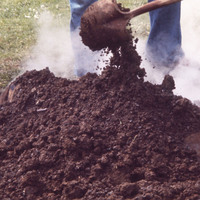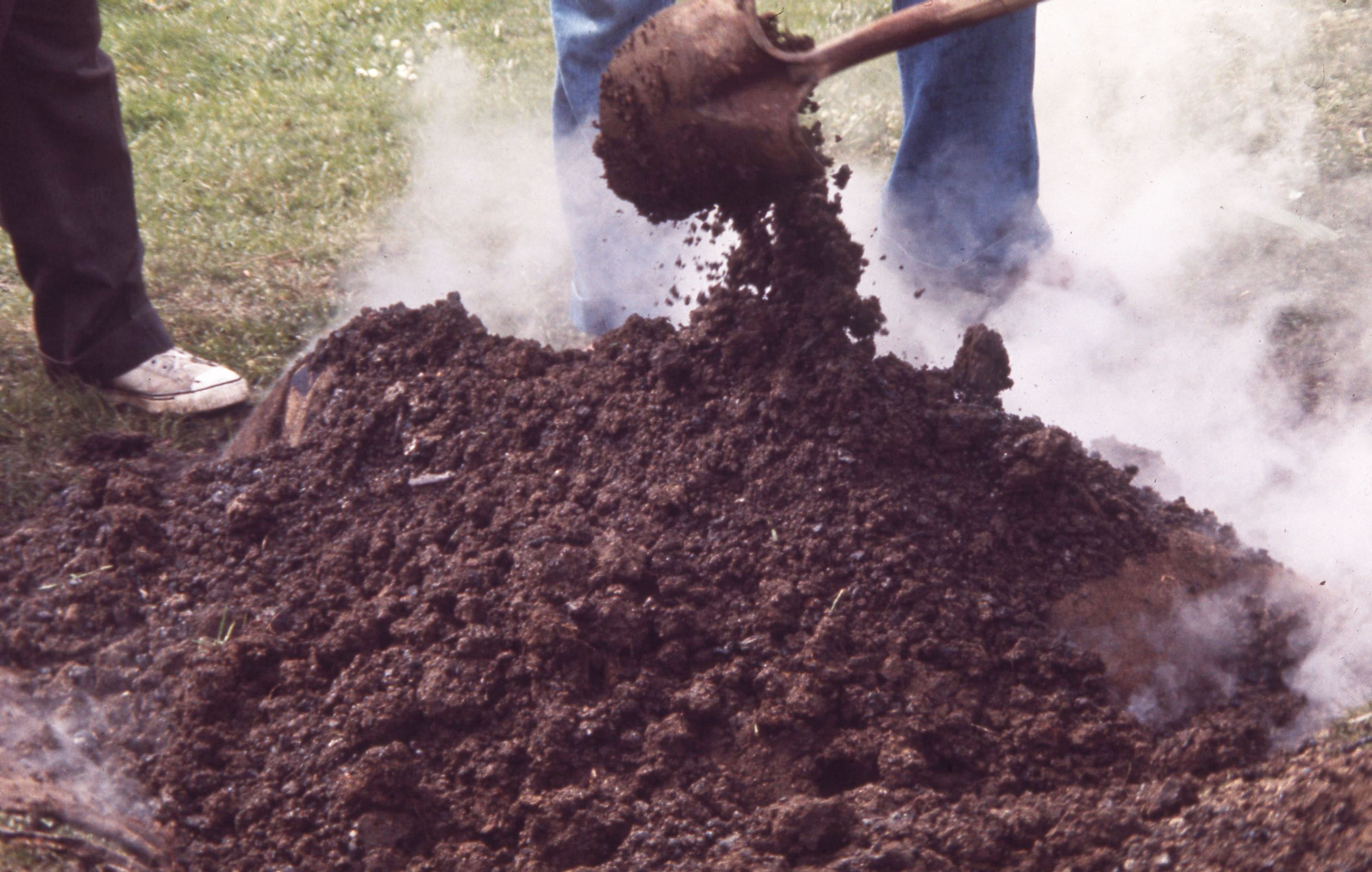 Students and family members from Hawaii shoveling dirt onto a roasting pit. They are preparing kalua pig for the 1976 Lu'au at Pacific University. Attendees, some wearing leis, watch in the background.