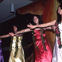 Five women dancers wearing satin dresses and maile-style leis, performing at Pacific University's annual Lu'au in 1976. These may have been "Princesses" in the Lu'au's "Court". In many years, the Lu'au featured performances of women dancers each wearing a different colored dress, who would each represent one of the Hawaiian islands. They would perform solo dances for a "King" and "Queen," who would watch from the stage. The backdrop on the set depicts a volcanic eruption.