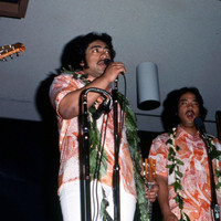 Two musicians on stage at Pacific University's annual Lu'au in 1976, wearing matching outfits and maile-style leis.
