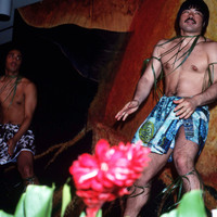 Male dancers wearing lavalava (or possibly malo) -style skirts, on stage at Pacific University's annual Lu'au in 1976.