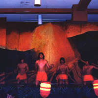 Male dancers wearing lavalava (or possibly malo) -style skirts, on stage at Pacific University's annual Lu'au in 1976.