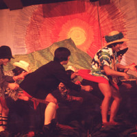 A group of male Pacific University students performing at the university's 1975 Lu'au. They appear to be dressed as tourists and are performing a humorous skit or dance, with each one bending over to grab the clothing of the man in front of him. The photographer, Peg Osland, was on the staff of Pacific's publicity department.