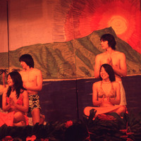 A group of Pacific University students performing on stage at the university's annual Lu'au in 1975. All are seated or kneeling; the men wear malo while the women wear skirts with bikini tops. The photographer, Peg Osland, was on the staff of Pacific's publicity department.
