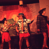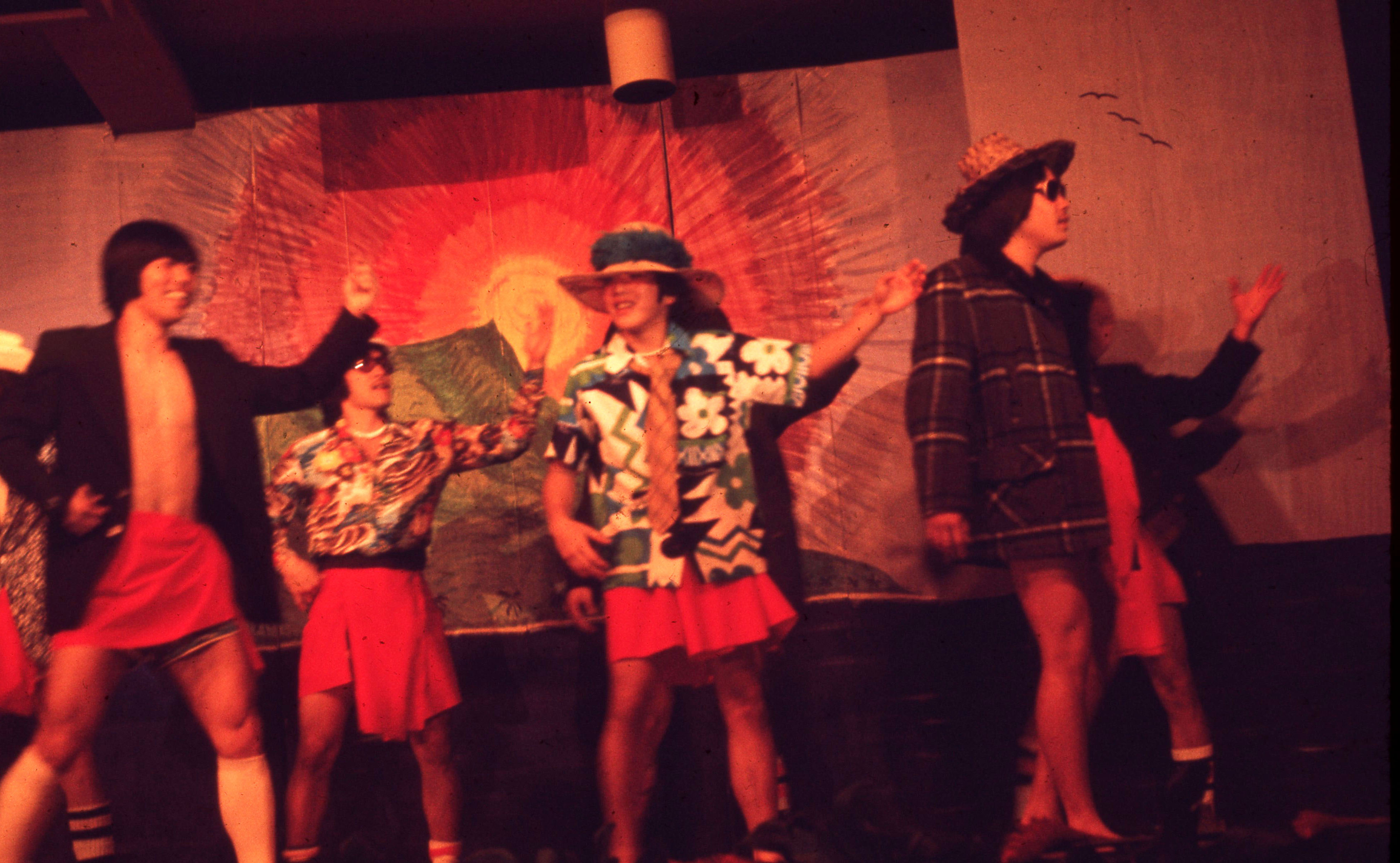 A group of male Pacific University students performing at the university's 1975 Lu'au. They appear to be dressed as tourists and are performing a humorous skit or dance. The photographer, Peg Osland, was on the staff of Pacific's publicity department.