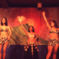 A group of women students performing a Tahitian-style dance on stage at Pacific University's annual Lu'au in 1975. Two are wearing Tahitian-style grass skirts and holding grass hand tassels; the other two are wearing matching bikini tops and skirts. The photographer, Peg Osland, was on the staff of Pacific's publicity department.