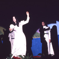 A hula dancer in a long white dress, performing under a spotlight at Pacific University's annual Lu'au in 1975. Based on her dress, which was typical for the role of the "Queen" of the Royal Court at the Lu'au, she may have been performing the "Queen's Dance," a tradition at Pacific's Lu'aus. The photographer, Peg Osland, was on the staff of Pacific's publicity department.