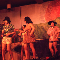 A group of male and female Pacific University students performing at the university's 1975 Lu'au. The men appear to be dressed as tourists, while the women wear sundresses. They are performing a humorous skit or dance. The photographer, Peg Osland, was on the staff of Pacific's publicity department.