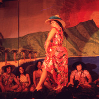 Pacific University students performing on stage at the university's annual Lu'au in 1975. The central character has pillows stuffed under her dress, and appears to be doing a humorous dance, with the other performers on stage laughing. The photographer, Peg Osland, was on the staff of Pacific's publicity department.