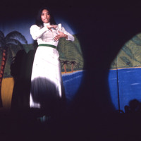 A hula dancer in a long white dress and a green belt, performing under a spotlight at Pacific University's annual Lu'au in 1975. Based on her dress, she may have been performing as a "Princess" in the "Royal Court," which was a tradition at Pacific's Lu'aus. The photographer, Peg Osland, was on the staff of Pacific's publicity department.