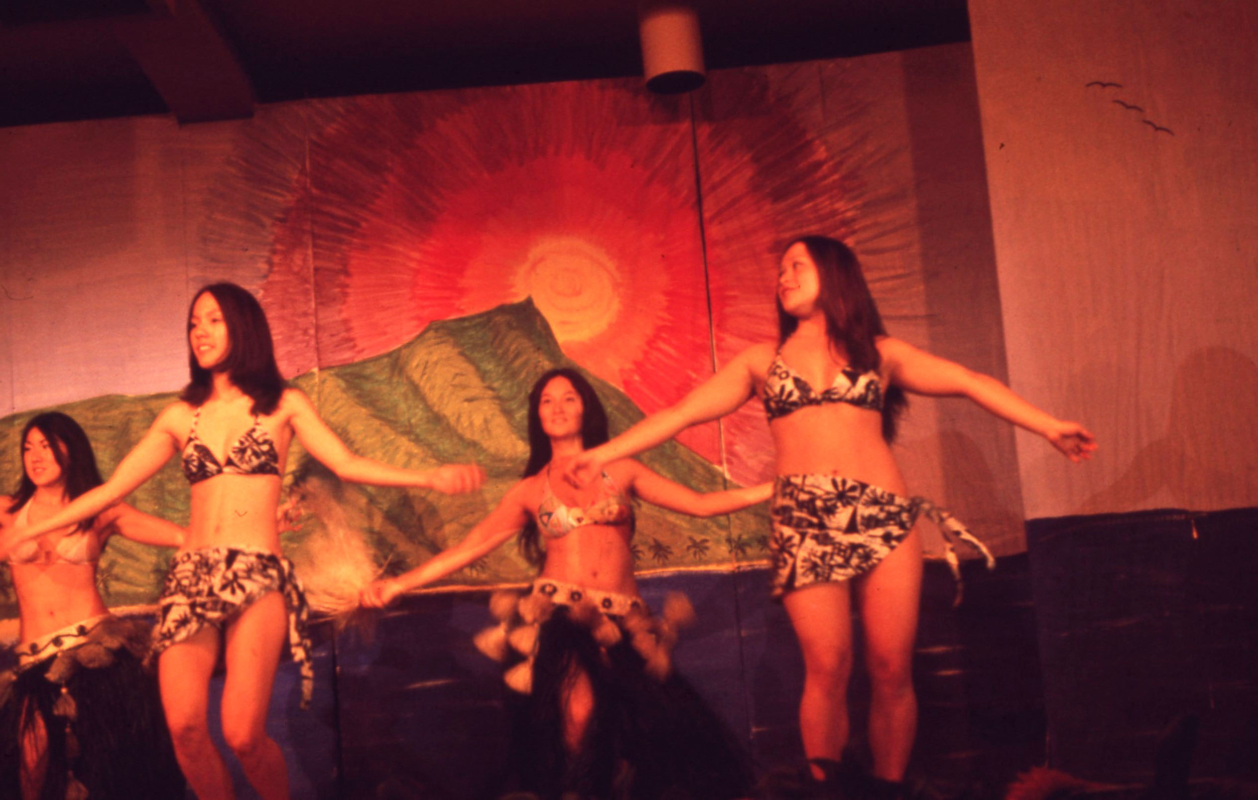 A group of women students performing a Tahitian-style dance on stage at Pacific University's annual Lu'au in 1975. Two are wearing Tahitian-style grass skirts and holding grass hand tassels; the other two are wearing matching bikini tops and skirts. The photographer, Peg Osland, was on the staff of Pacific's publicity department.
