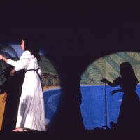 A hula dancer in a long white dress and a blue belt, performing under a spotlight at Pacific University's annual Lu'au in 1975. Based on her dress, she may have been performing as a "Princess" in the "Royal Court," which was a tradition at Pacific's Lu'aus. The photographer, Peg Osland, was on the staff of Pacific's publicity department.
