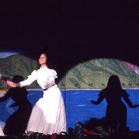 A hula dancer in a long white dress and a blue belt, performing under a spotlight at Pacific University's annual Lu'au in 1975. Based on her dress, she may have been performing as a "Princess" in the "Royal Court," which was a tradition at Pacific's Lu'aus. The photographer, Peg Osland, was on the staff of Pacific's publicity department.