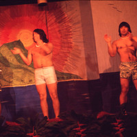 Several male Pacific University students performing on stage at the university's annual Lu'au in 1975. The photographer, Peg Osland, was on the staff of Pacific's publicity department.