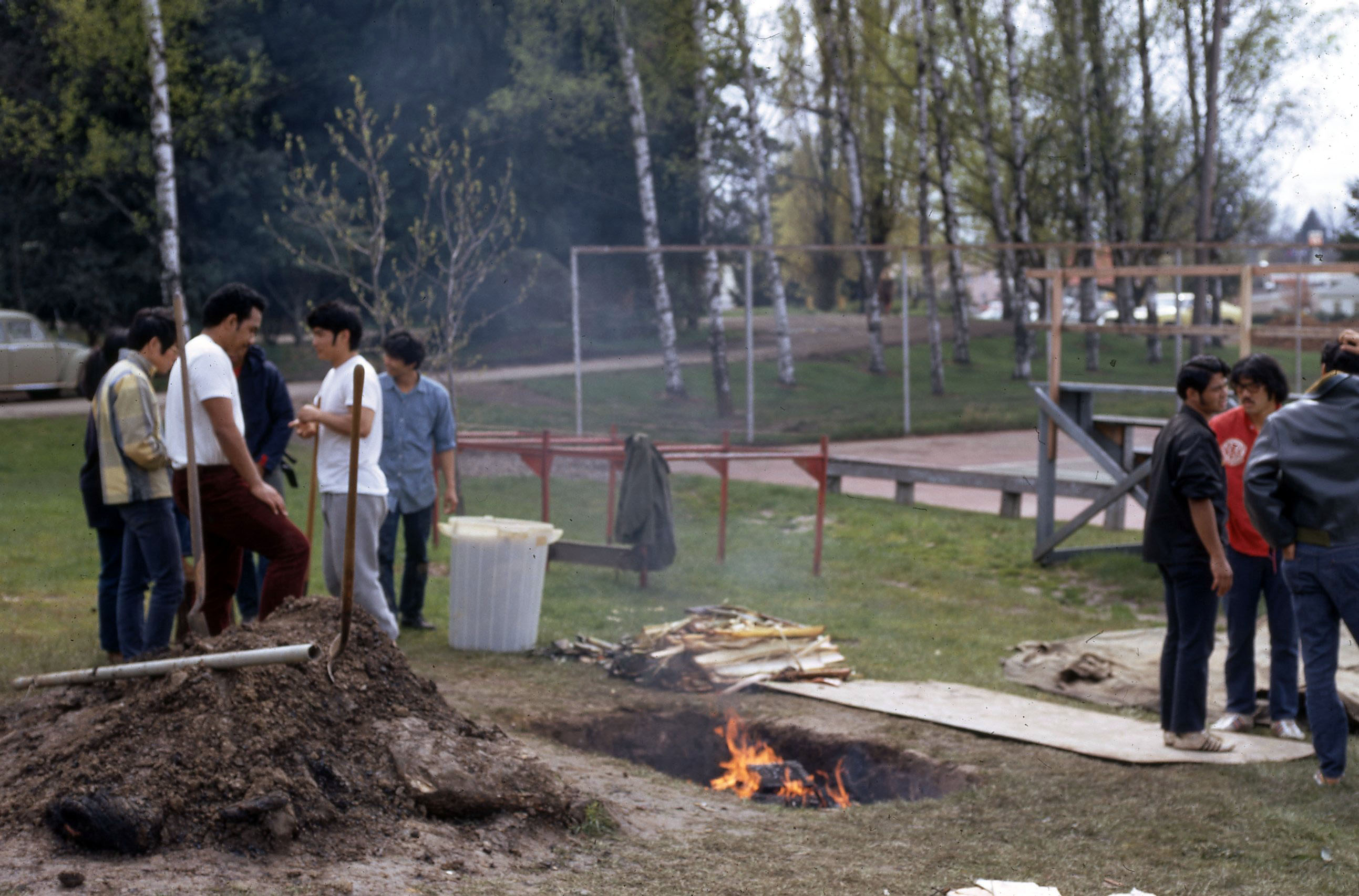 A group of students and/or family members tend the kalua pig pit roast at Pacific University's annual Lu'au in 1972.