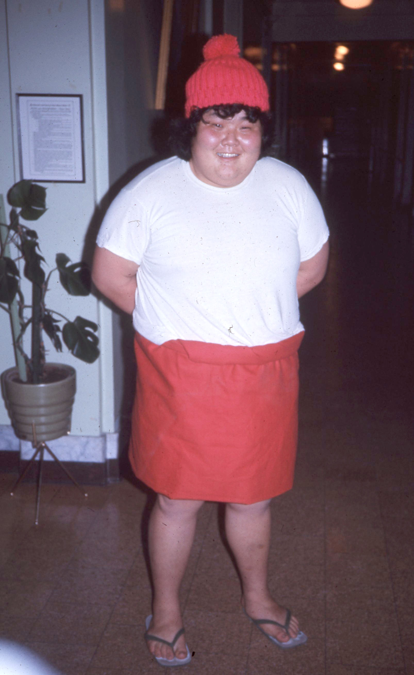 - Elton Sumida, a Pacific University student (class of 1973), dressed in a red cap and skirt in December, 1971. This image may have been taken during a Haumana O Hawai'i (Hawaiian Club) holiday event.