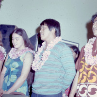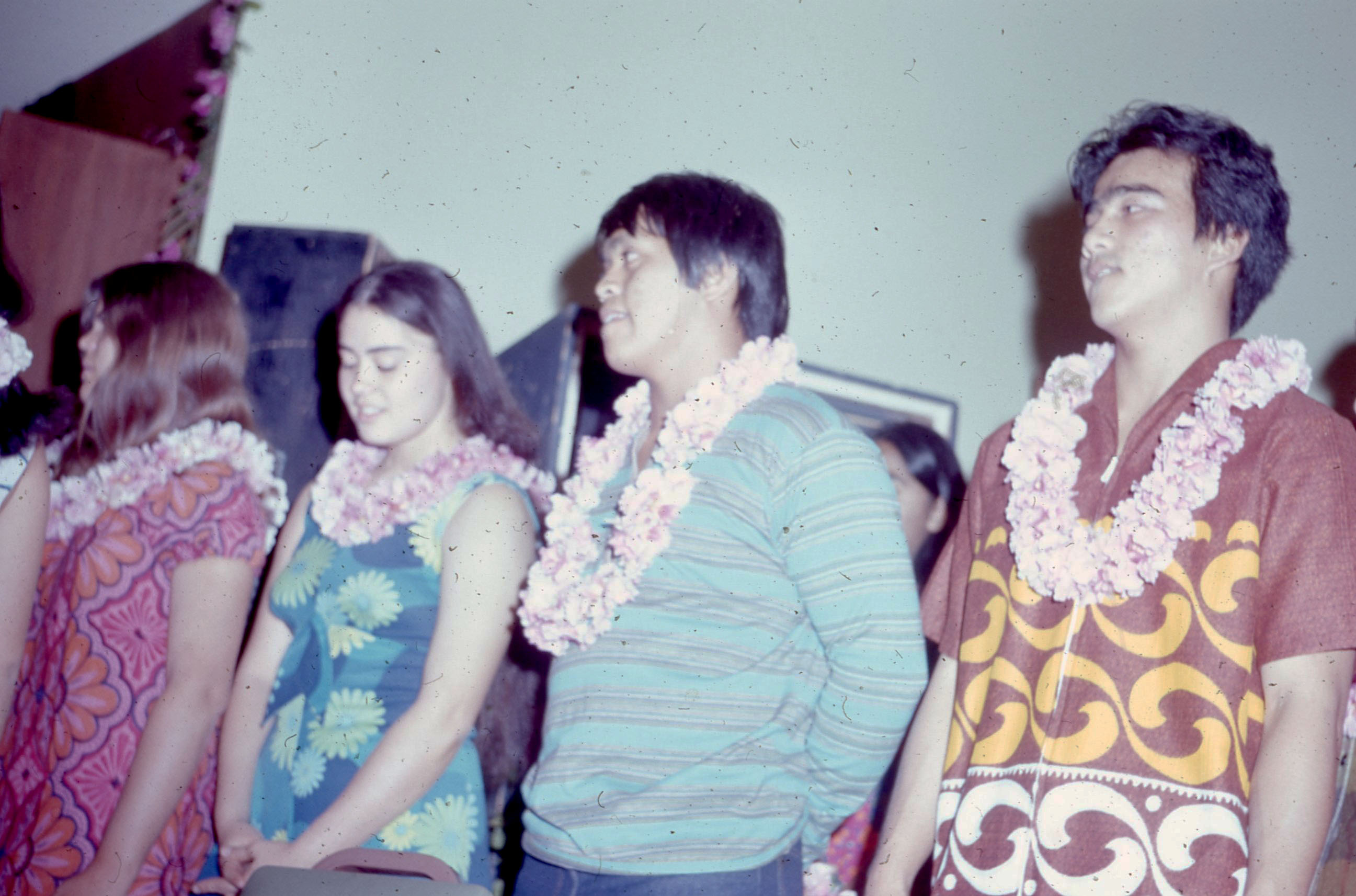 Pacific University students attending the Haumana O Hawai'i Homecoming Dance performance in October, 1971. They are identified on the original slide as: Jeannie Adams; Zanetta Fontes; Dennis Ribellia; and Rocky Balada.