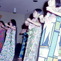 Pacific University students performing at the Haumana O Hawai'i Homecoming Dance performance in October, 1971. They are identified on the original slide as: Gwen; Ester; Renee; and Annabel Ono.