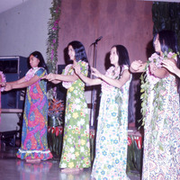 A line of women student dancers performing at the Haumana O Hawai'i Homecoming Dance in October, 1971. Some are identified on the original slide as: Deborah [Chun?]; Nancy [Rodrigues; wearing pink]; Gwen; Esther; Renee; and Ana.