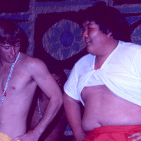 Pacific University students performing at the university's annual Lu'au, probably in 1971. The are identified on the original slide as Bill Vincent (Class of 1973) and Elton Sumida (Class of 1973). They were two of a group of male students who performed a dance where half of the men cross-dressed in white t-shirts and red skirts. This drag performance was a regular part of the Luau during this time period. The image is dark and underexposed.