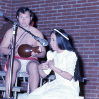 Pacific University students performing at the university's annual Lu'au, probably in 1971. The are identified on the original slide as Mike Ben (Class of 1971) and Leslie Howell (Class of 1971).