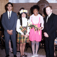 Two Pacific University students: probably Jill Matsui (Class of 1972) and Linda Jenkins, with two male escorts. This photograph may have been taken during Homecoming weekend in 1970. Matsui was crowned Homecoming Queen that year, and Jenkins was chosen as the Black Student Union's representative on the Homecoming Court. The sign behind them reads, "Welcome A...": possibly a welcome sign for alumni whose reunions typically occurred during Homecoming.