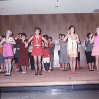 A dance performance of Pacific University women students circa 1970. The original slide is labeled "Homecoming, 1970." Dancers in the front row are wearing 1920s-style flapper costumes.