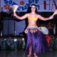 Pacific University student Bobbi Rapozo performing at the 1970 Haumana O Hawai'i Homecoming Dance. She is wearing a Tahitian-style costume with a purple grass skirt.