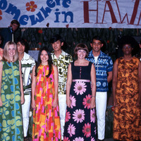 Pacific University student Jill Matsui (wearing red, pink and orange dress), who had just been crowned Homecoming Queen, on stage at the Haumana O Hawai'i Homecoming Dance in October, 1970. She is flanked by the women who had been elected members of her "Court", including: Marcia Englund; Linda Jenkins (wearing dark orange and black); Mary Ann Lazelle; and Lynette Sites. Attendants who were members of Haumana O Hawai'i (Hawaiian Club) stand behind them. A banner announcing the theme of the dance performance, "Somewhere in Hawaii", hangs in the background.