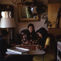 Pacific University students, all of whom were part of Haumana O Hawai'i (Hawaiian Club), playing the board game "Aggravation" in 1970. A note on the original slide identifies them as: Rene Akiyama; Marge Teruya; Sue Uyetake; and Carl Itamura. This photograph was likely taken during a club meeting or event.