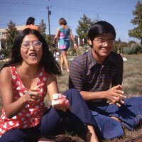 - Pacific University students Thomas Nitta and an unidentified friend sitting outdoors in 1970, probably at a Haumana O Hawai'i (Hawaiian Club) event.