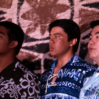 Chorus singers at Pacific University's annual Lu'au in 1969. According to the student newspaper, the 1969 Lu'au featured "a newly organized Hawaiian choir that will sing traditional Hawaiian and modern songs." The singers are identified on the original slide as: Ken [K...?], Flor Matias (Class of 1972) and Nathan Harada (Class of 1970).