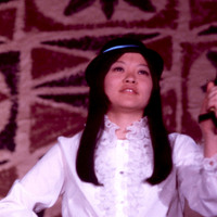 A dancer wearing a blue satin skirt and a white ruffled top, performing at Pacific University's annual Lu'au in 1969.