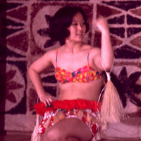 A dancer holding hand tassels and wearing a tasseled belt, on stage at Pacific University's annual Lu'au in 1969. She may have been a part of the Tahitian-style dance performance, which was a part of the Luau.