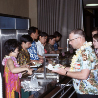 Attendees getting Hawaiian food from the buffet line at Pacific University's annual Lu'au in 1968. The man in the front of the line has a name tag identifying him as Gordon Bolton. Haumana O Hawaii (Hawaiian Club) members are serving the food.