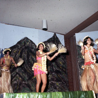 Four women performing a Tahitian-style dance at Pacific University's annual Lu'au in 1968. They are wearing grass skirts with tasseled belts and holding i'i (hand tassels).