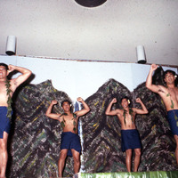 Four men wearing blue malo or lavalava -style skirts, on stage at Pacific University's annual Lu'au in 1968.
