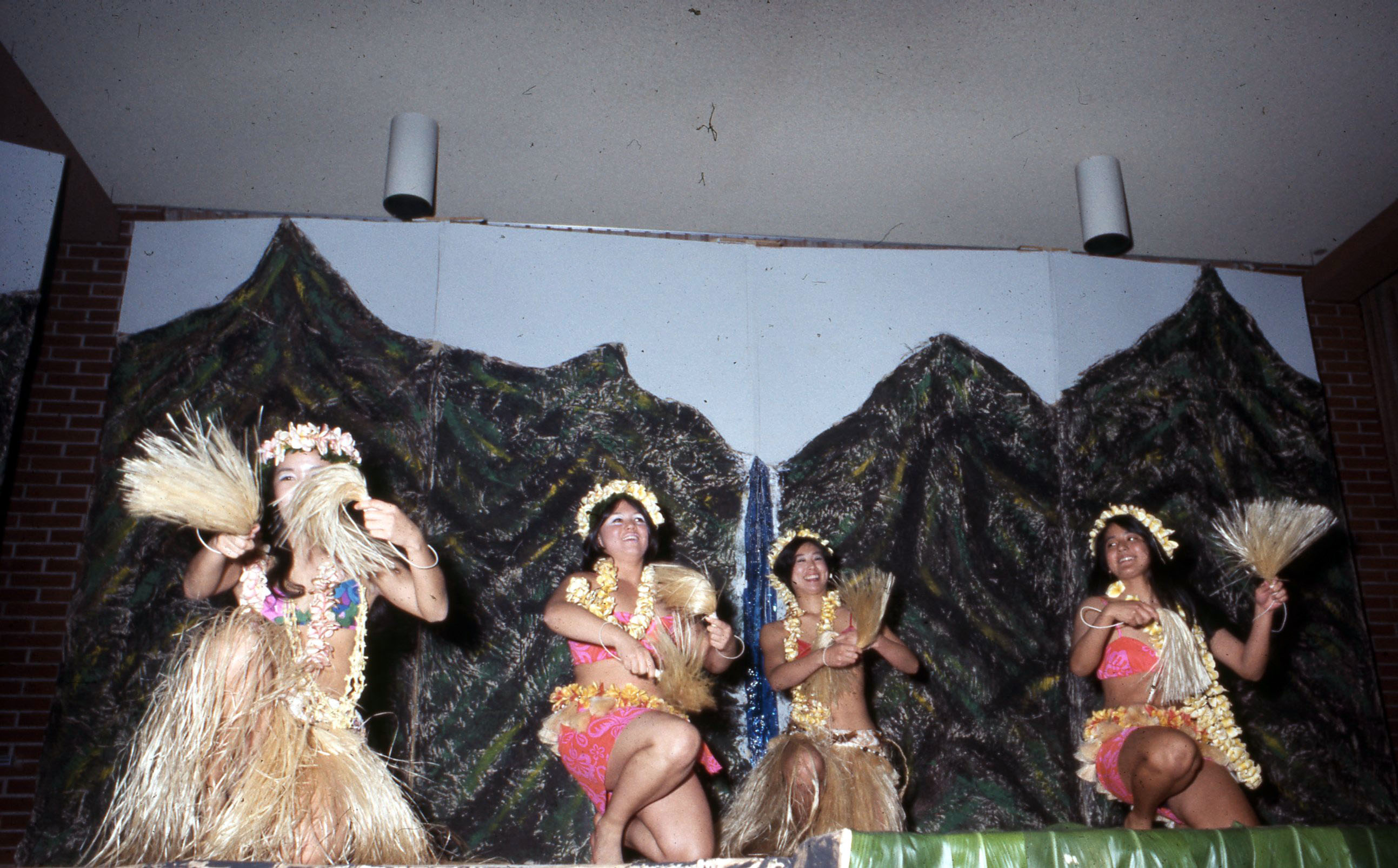 Four women performing a Tahitian-style dance at Pacific University's annual Lu'au in 1968. They are wearing grass skirts with tasseled belts and holding i'i (hand tassels).