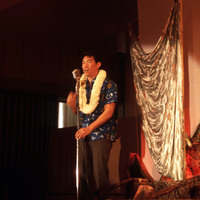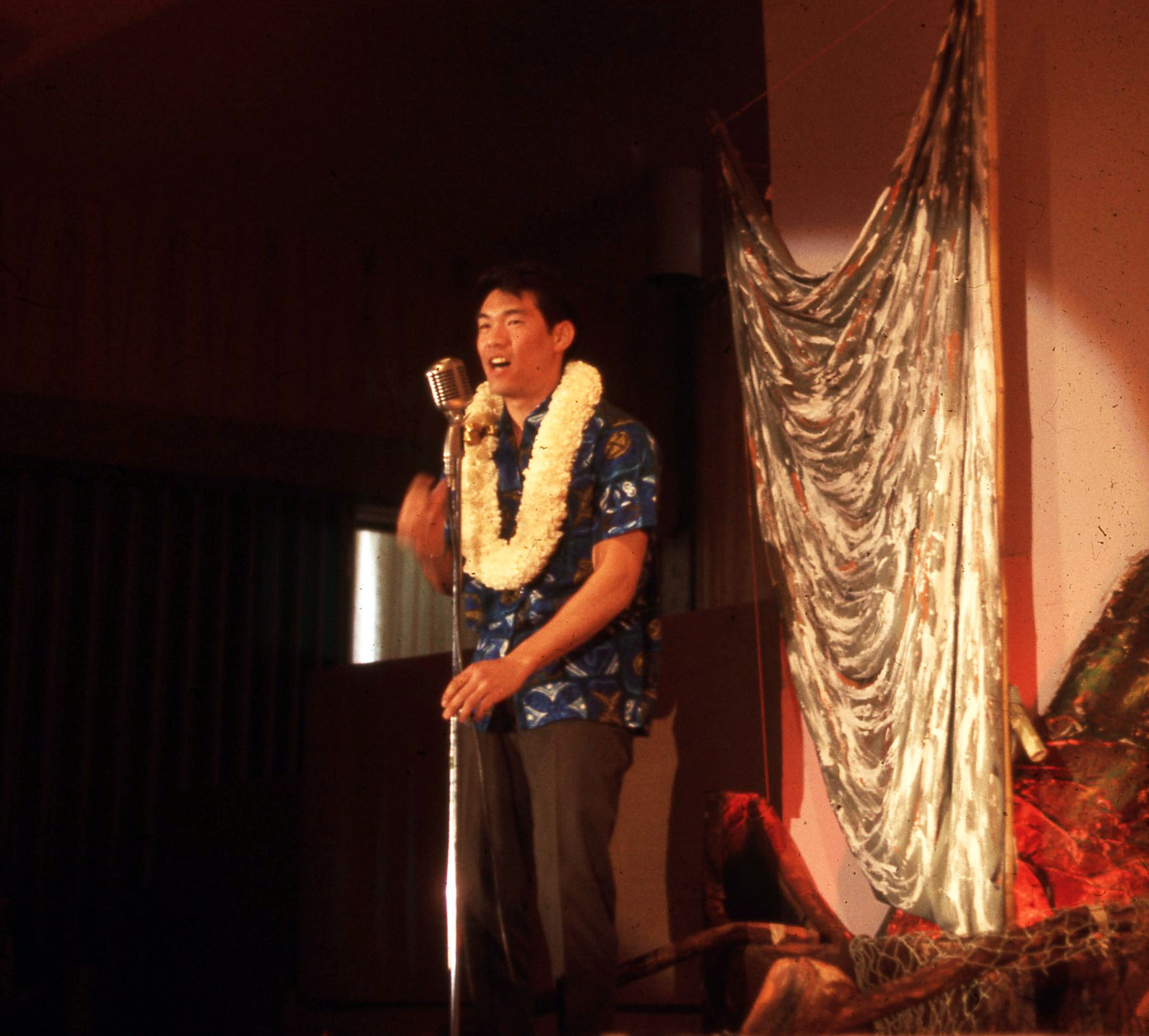 A man wearing a blue aloha shirt, speaking at a microphone on stage at Pacific University's annual Lu'au in 1968, possibly serving as an announcer for the performances.