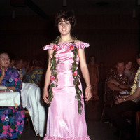 A student in a pink dress portraying a "Princess" as part of the Royal Court at Pacific University's 1968 Lu'au. The Royal Court was a part of the "Hawaiian Pageant" portion of the event. The King and the Queen would preside over performances by Princesses, each wearing a differently colored dress, who represented the islands of Hawai'i.
