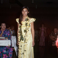 A student in a yellow dress portraying a "Princess" as part of the Royal Court at Pacific University's 1968 Lu'au. The Royal Court was a part of the "Hawaiian Pageant" portion of the event. The King and the Queen would preside over performances by Princesses, each wearing a differently colored dress, who represented the islands of Hawai'i.