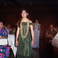 A student in a green dress portraying a "Princess" as part of the Royal Court at Pacific University's 1968 Lu'au. The Royal Court was a part of the "Hawaiian Pageant" portion of the event. The King and the Queen would preside over performances by Princesses, each wearing a differently colored dress, who represented the islands of Hawai'i.