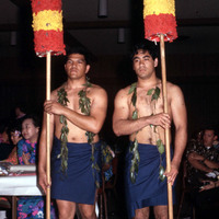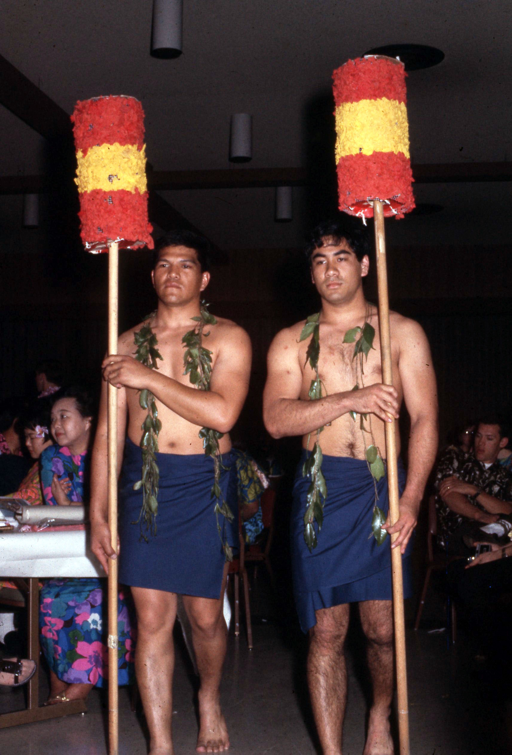 Two male performers at Pacific University's annual Lu'au in 1968. They are carrying red and yellow standards, which were meant to represent kāhili, the traditional feathered symbols of Hawaiian royalty. These guards entered the Luau preceding the "King" and "Queen", who presided over part of the Lu'au performance.