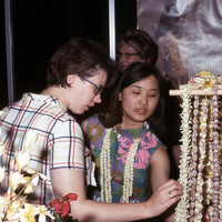 A woman customer examines the leis being sold by a vendor at Pacific University's annual Lu'au in 1968.