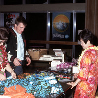 A man and a woman examine Hawaiian clothing for sale by a vendor at Pacific University's annual Lu'au in 1968.