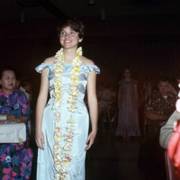 A student in a pale blue dress portraying a "Princess" as part of the Royal Court at Pacific University's 1968 Lu'au. The Royal Court was a part of the "Hawaiian Pageant" portion of the event. The King and the Queen would preside over performances by Princesses, each wearing a differently colored dress, who represented the islands of Hawai'i.
