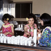 Three women students prepare drinks (possibly coffee) in styrofoam cups for the attendees of Pacific University's annual Lu'au in 1968. They are likely preparing for audience members to enter the buffet line as part of the dinner served at the Lu'au.