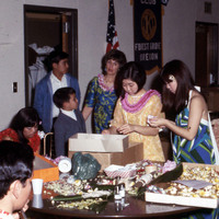 Pacific University student members of Haumana O Hawai'i (Hawaiian Club), making leis at a table just before the university's annual Lu'au in 1968. Students' family members shipped flowers, leaves and other fresh materials by air to supply the event.