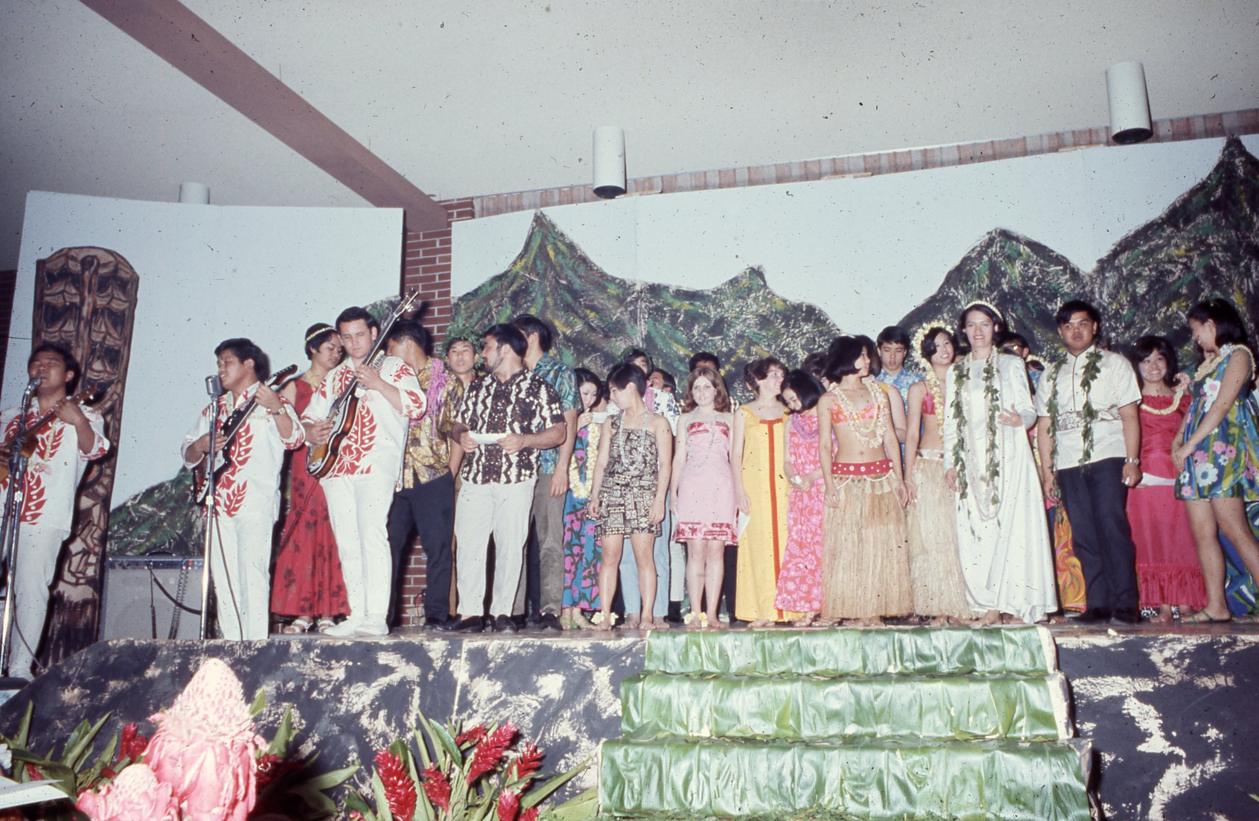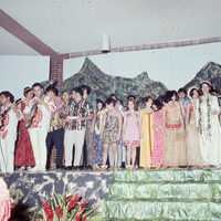 A gathering on stage of all the performers from Pacific University's annual Lu'au in 1968, including dancers and musicians. This photograph was taken in Washburn Hall.
