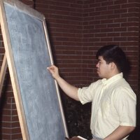 A student writing on a chalkboard, backstage at the university's annual Lu'au in 1968. He is writing down the expenses for various items in the event's budget, including the costs for transportation, publicity, concessions, food, costumes, and so on.